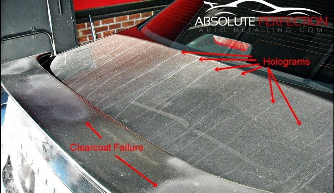 The second issue in this picture above is the lines on the trunk lid. The lines are able to be seen in direct sunlight (as in this picture) or in correct lighting. These are known as holograms and are cause when a detailer or body shop uses a high speed rotary polisher as their last step of polishing. Where these machines are great for removing defects in the paint, an additional final polishing step via a dual action polisher should be completed to remove these hologram marks, leaving the paint perfect. The lines are caused by the heat and friction of either the wool or foam pad being used on the rotary polisher. A lot of “old school” detailers use these machines as their final step, leaving behind these holograms, and then trying to temporarily hide them with glaze. At Absolute Perfection Auto Detailing we go through ALL the steps from start to finish getting your vehicle looking great.